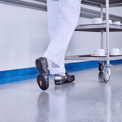 A sola foi desenhada para reduzir o risco de escorregamento em pisos com gorduras e humidos.